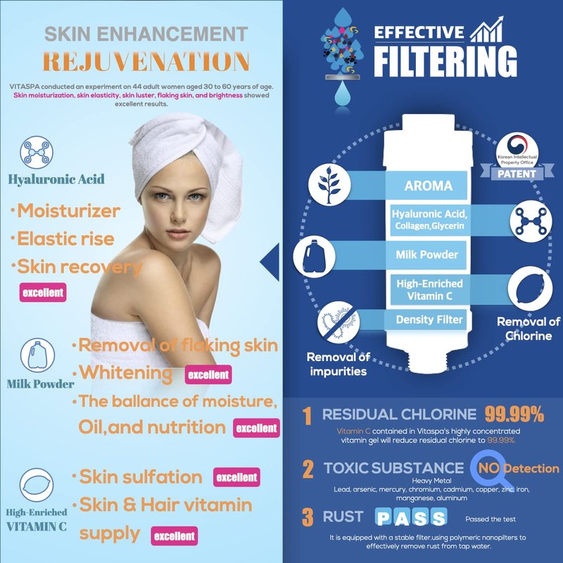 WHAT'S IN THE BOX: Includes - VITASPA shower filter + 2 Extra silicon ringsFEATURE & CERTIFICATION1. SKIN ENHANCEMENT & SKIN Trouble REDUCTION & HAIR ENHANCEMENT (tested by iEC KOREA , Korea Institute of Dermatological Science)2. AROMA THERAPY ( six kinds of aroma)3. Have an antioxidation effect by high-Enriched VITAMIN C4. REMOVE RUST from tap water5. REMOVE Toxic Substance (tested by Korea Water & Environment Research Institute)6. RESIDUAL CHLORINE (tested by Korea Testing & Research Institute)7. ATOPY DERMASTITIS (by WAA world atopy association)8. PATENT (by Korea Intellectual Property Office)PRECAUTIONS - Shock Caution- Using water over 60 degrees frequently can speed up the time to replace the product- Do not use other than shower filterApplication of Extra silicon ringSometimes the problem caused by the aging of the rubber ring in shower hose is mistaken for a defect in the shower filter.Old rubber ring can cause water leakage when connecting shower filter and shower hose.So we provide our customers with durable silicon rings to solve these problems.-If water leaks from the shower hose after installation,Replace the old rubber ring in the shower hose with a new silicon ring.-Then the problem can be solved and the usage period of the shower hose can be extended.SPECIFICATIOUse of products - shower head filterWeight of products - shower filter (149g)Height of products - shower filter (5.3 inch)Shower filter's Main ingredient - Vitamain C, Milk powder, Aroma, Hyaluronic acid, Collagen, Glycerin, polypropylene filterPeriod of use - Shower filter - About 45~60 days (Based on a family of four)Expiration of date - three years from the date of manufactureMade in Korea
