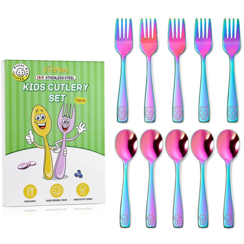 VITEVER 10 Pack Toddler Utensils, Stainless Steel Rainbow Silverware Set for Kids, Children Safe Cutlery Set Includes Forks and Spoons - Dishwasher Safe