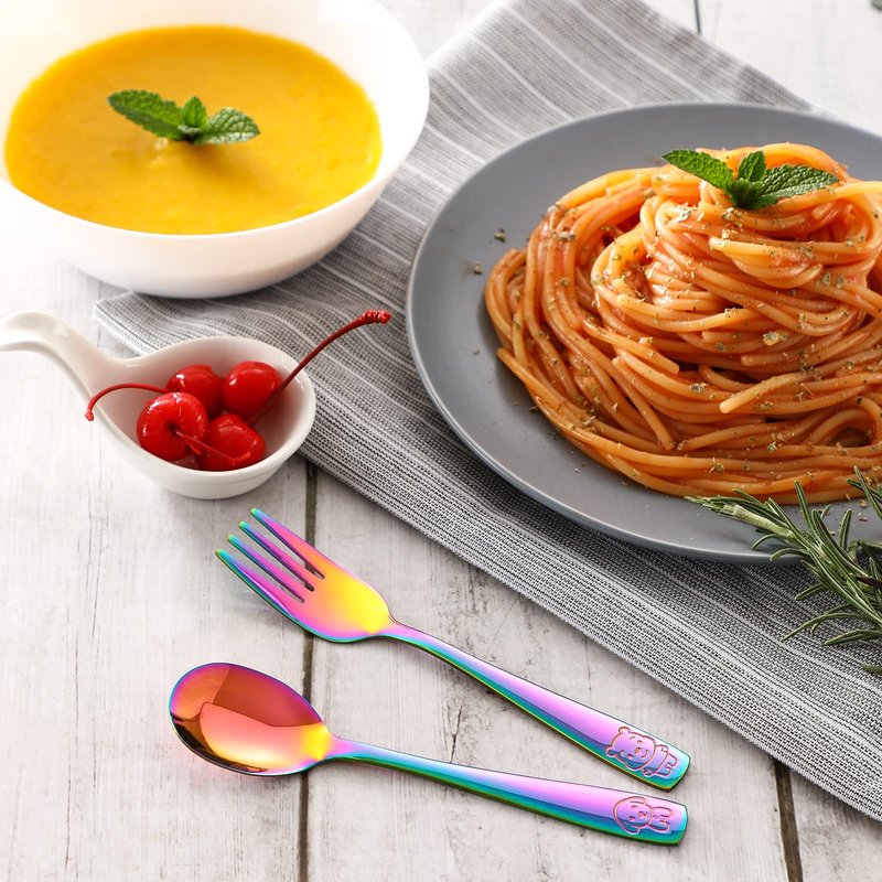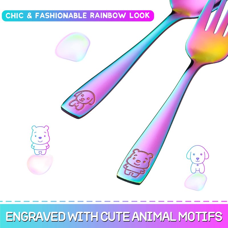 - PREMIUM 18/0 STAINLESS STEEL: All the cutlery are made of 100% high-quality 18/0 stainless steel, that is totally food safe for children, and non-toxic. As premium stainless steel, they will not rust or corrode, which will not produce any harmful substances for children, and parents can rest assured to buy it for your kids. Meanwhile, they are dishwasher safe, so you can directly put them in it to wash with your daily silverware.