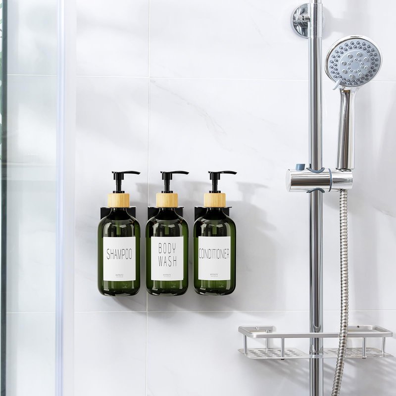 VITVITI Shampoo and Conditioner Dispenser, Body Wash Shower Soap Dispenser Wall Mounted 3 Chamber, Drill Free 17oz Plastic Shower Bottles for Bathroom, Dark Green 3 Sets