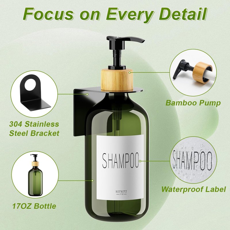 - 🚿【Extra Free Pump Head】You will get 3 17oz shower bottles, 2 paste Tools, 3 auxiliary stickers, 3 wall mount brackets, 6 labels, and 1 Extra Pump Head to prevent damage during use.