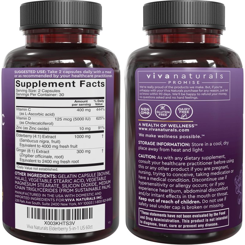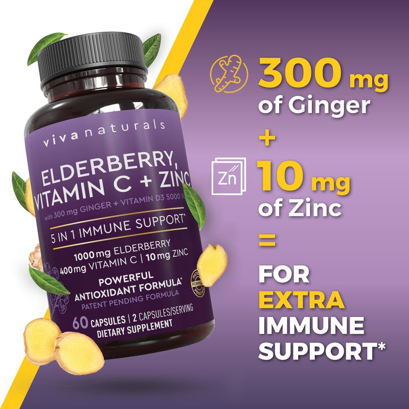 - ELDERBERRY EXTRACT WITH ZINC AND VITAMIN C – Viva Naturals Elderberry supplement for adults combines the strength of five high quality immune supporting ingredients.* We have added a high potency of Vitamins C and D for extra support of immune health.*