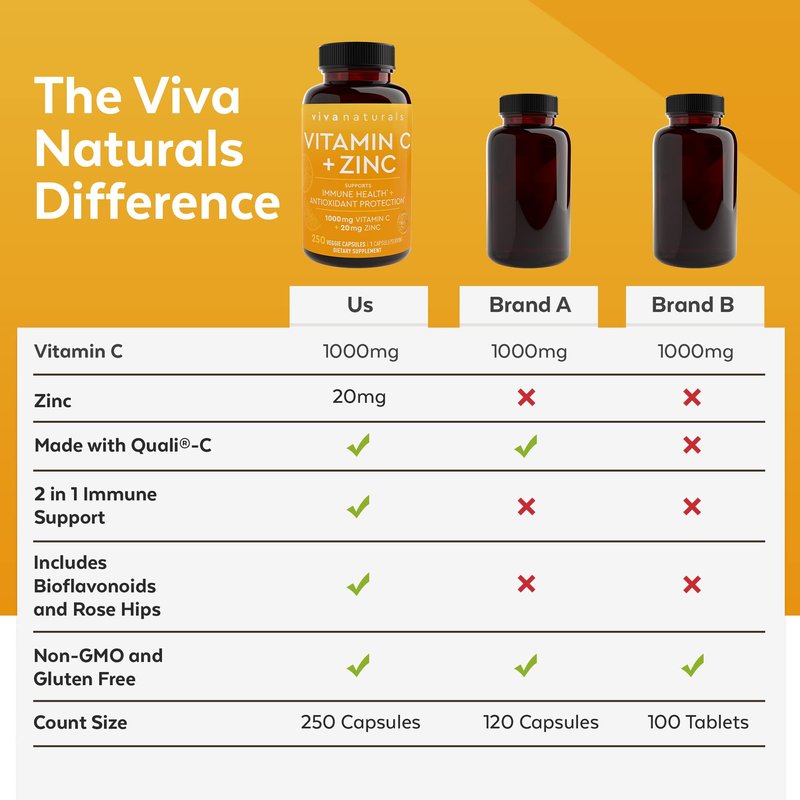 Made with a proprietary blend, Viva Naturals Vitamin C capsules deliver a high-quality, Non-GMO vitamin C that includes Quali-C from Scotland. Rich in both Vitamin C and Zinc, these capsules are Non-GMO, gluten-free, vegetarian friendly, and manufactured without artificial dyes, salt (NaCl), soy or dairy.