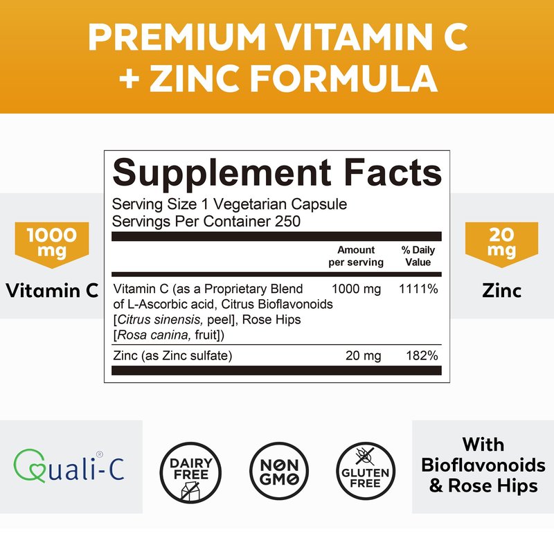- ✔️ High-Potency Vitamin C 1000mg + Zinc 20mg Capsules – Convenient daily dose of Vitamin C plus Zinc for immune support.* Each capsule includes a proprietary blend of vitamin C that includes Quali-C from Scotland, a premium ascorbic acid source.