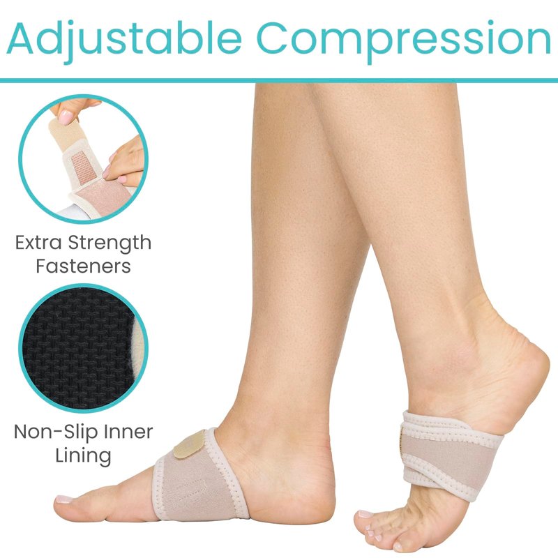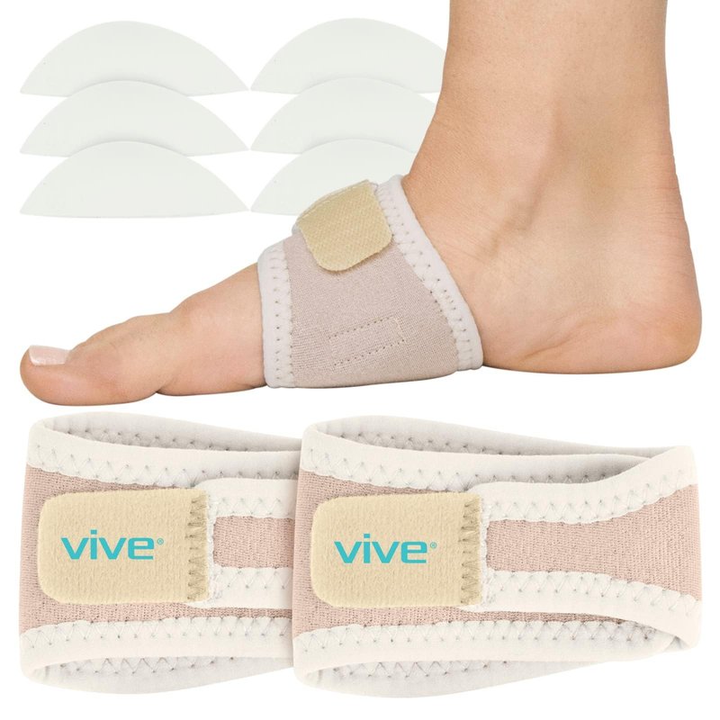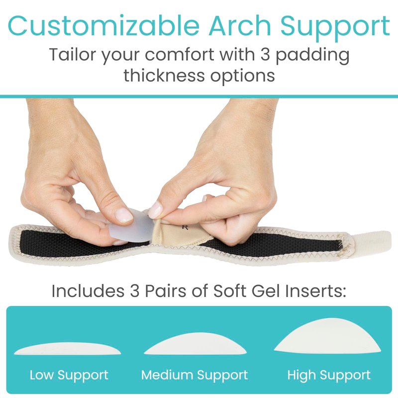 Arch Support by Vive Lifting and supporting the arch, the Vive arch support provides adjustable compression to relieve painful foot conditions such as plantar fasciitis, heel spurs, sprains and strains. Including three soft gel inserts, the adjustable compression brace has a integrated pouch, allowing you to choose the right amount of upward compression for your arch. Breathable and lightweight, the low-profile support brace easily fits in most shoe styles and also provides comfortable support for walking barefoot. Plantar Fasciitis and Heel Pain Relief: Providing relief from painful foot conditions such as plantar fasciitis, heel spurs, strains and sprains, the adjustable compression brace supports the arch while in motion to reduce pain while exercising, hiking or walking. The adjustable arch brace also relieves knee, hip and back pain by maintaining proper foot alignment. Adjustable Compression Support: Supplying upward compression and support, the arch support brace has an integrated pouch that holds up to three soft gel inserts for added support and comfort. The brace lifts and supports the arch while standing and helps to maintain proper foot alignment during motion, both pronation and supination. Designed for comfort, the low-profile arch brace can be worn with most shoes and sandals, with or without socks or barefoot. Stays In Place All Day: Secure the brace in the most comfortable position with the strong fastener strap that also allows the level of compression to be adjusted for optimal support and comfort. The inner lining is made with a non slip material that holds the brace firmly in place, eliminating slipping, bunching and pinching for a comfortable, secure fit.