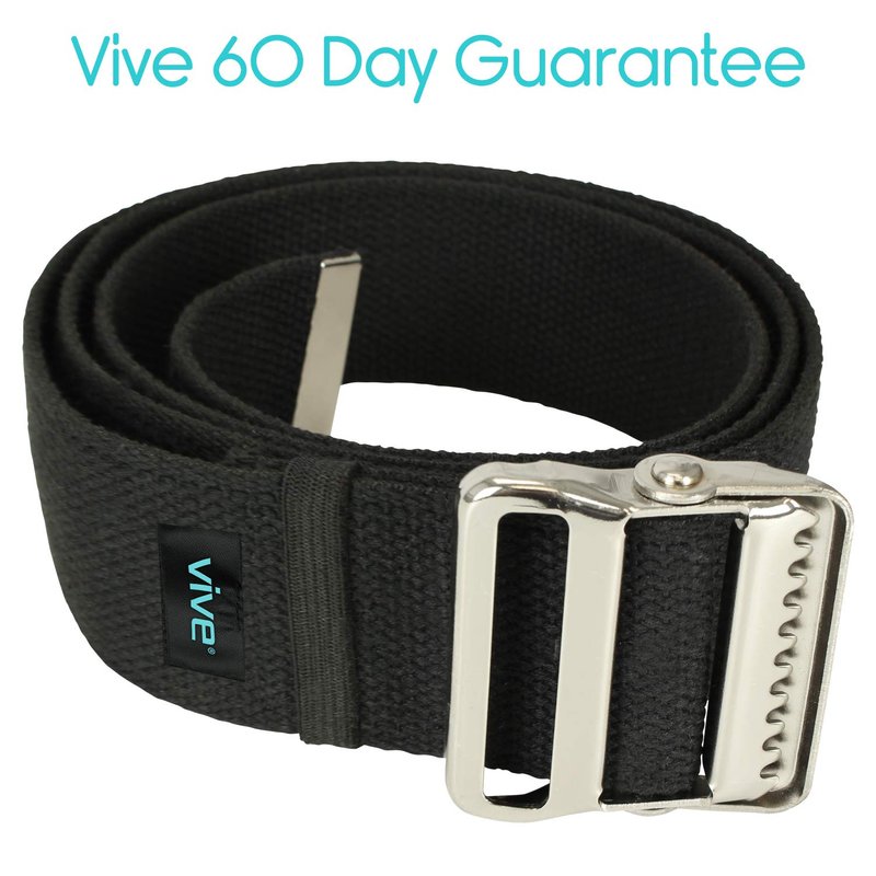 The Transfer Belt by Vive allows you to easily ambulate patients. The quick release latch makes it easy to put on and remove the belt, while the tough metal locking teeth keep the belt securely in place to create a strong hold for added safety. The durable metal buckle is strong enough to handle bariatric patients. Key features of the product include hand loops, easy ambulation, a quick release latch, locking teeth, an all-metal buckle, strong grab handles, and a length of 55 inches. The teeth on the metal buckle create a strong hold and will not let go until the release latch is lifted. The durable metal buckle is suitable for bariatric patients. Grab handles provide extra support for added safety while lifting. The belt makes transferring patients from beds, chairs, and wheelchairs simple, making it great for home or hospital use. It is backed by a Vive Health 60-day unconditional guarantee, ensuring you can order with confidence.
