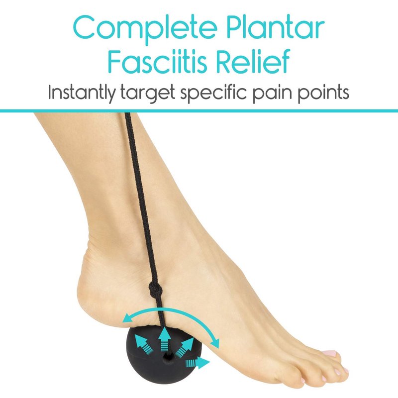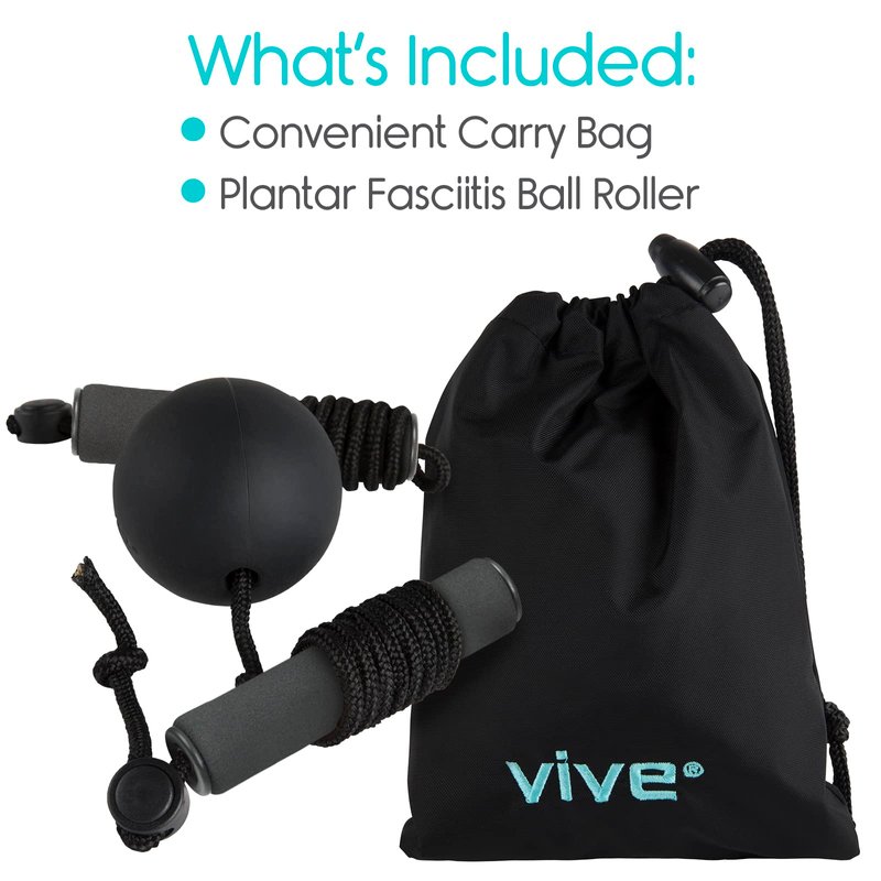 Plantar Fasciitis Ball Roller by Vive Relieve foot pain, pressure and stress with the Vive plantar fasciitis ball roller. The ball roller provides concentrated self-massage to relieve plantar fasciitis pain, arch pain, heel spurs and more. The high-density silicone ball features integrated foam handles to provide greater control over positioning and pressure for optimal pain relief. The portable ball roller is great for nurses, teachers, restaurant staff and anyone on their feet all day that need to revitalize. Durable 2.5” Ball Roller: Sized to perfectly contour to the arch of the foot for maximum effectiveness. The high density, non-marking silicone is firm, allowing the massage ball to provide concentrated relief while retaining its shape without splitting or cracking under pressure. Targeted Foot Pain Relief: Providing relief from plantar fasciitis pain, heel spurs, arch pain, muscle soreness and stiffness, the Vive plantar fasciitis ball roller allows you to effectively target painful pressure points with self-myofascial massage. Increasing circulation and flexibility, the ball roller will also help to reduce inflammation and relieve tension and stress in the foot muscles, ligaments and joints. Great for those on their feet all day, the roller also reduces general achiness and fatigue. Integrated Handles For Greater Control: Integrated, multi-position foam handles allow you to effectively target painful areas. The handles also allow you to control the amount of pressure that is applied for comfortable relief from foot pain, thus ensuring a personalized touch during each use. Each handle cord is adjustable for ease of use, whether seated or standing. What’s Included: Vive plantar fasciitis ball roller Carry Bag