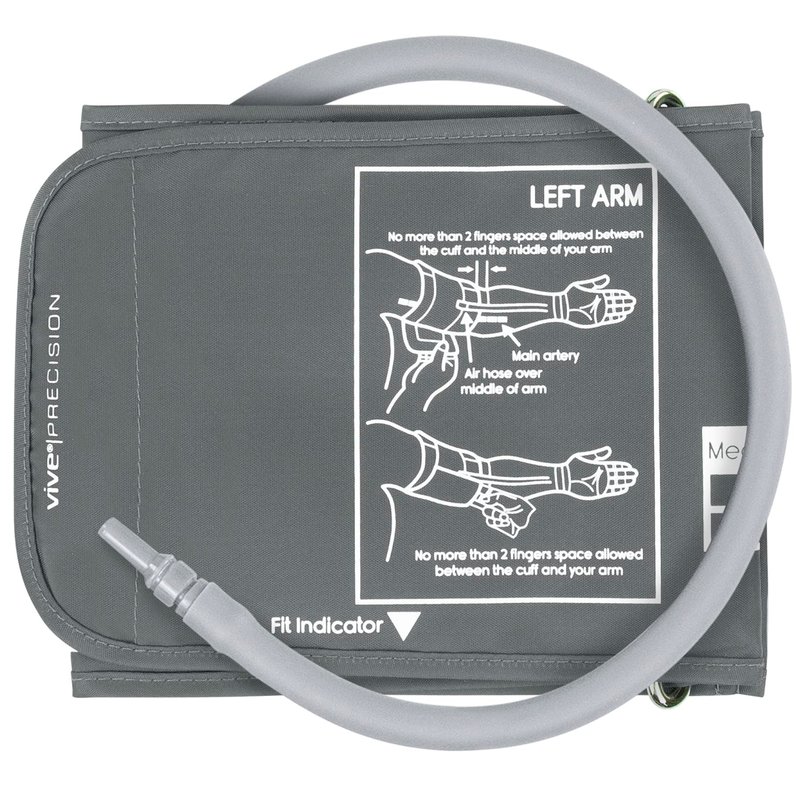 Blood Pressure Monitor Replacement Arm Cuff Easily replace worn arm cuffs with the Vive Precision blood pressure arm cuff. Featuring a straight connector, the upper arm cuff is compatible with the Vive Precision blood pressure monitors and similar models, including the Omron 10 Series monitors. The latex-free arm cuff is constructed with a durable nylon material and is easy to self-adjust, fitting a wide range of arm circumferences. Simple to Install: Easily replace worn or damaged blood pressure monitor cuffs with the Vive Precision replacement arm cuff. The replacement upper arm cuff has a straight connector for easily connecting to the existing monitor. Compatible Design: Capped with a standard straight connector, the replacement arm cuff is compatible with Vive Precision blood pressure monitor, Omron 10 Series and similar models. Adjustable Cuff Size: Featuring an integrated D-ring, the replacement blood pressure monitor cuff is easy to self-adjust for greater accuracy. Sturdy Nylon Construction: Durably constructed with a strong nylon material and latex-free hose for long term usability. What’s Included: Vive Precision Replacement Arm Cuff