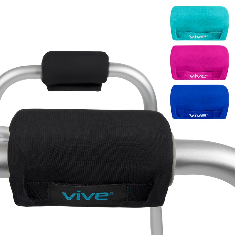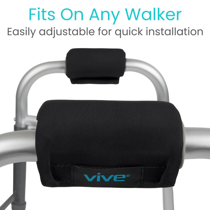 Walker Padded Handles by Vive Reduce hand and wrist soreness and irritation with the Vive padded walker hand grips. Quickly installing on any standard walker, the hand grips are padded with a contoured foam to relieve painful pressure points and reduce hand and wrist fatigue. Durably constructed with a breathable, moisture-wicking material, the handles stay cool and dry to provide a comfortable and secure grip every time. Comfortably Padded Hand Grips: Reducing hand and wrist pain and fatigue, the walker hand grips are padded with a contoured foam for a comfortable and secure grip. Generously padded, the walker hand grips relieve soreness and irritation caused by standard walker handles. The latex-free padded walker handles easily install on any walker with a simple hook and loop closure, providing a stable, nonslip surface for your hands to rest on a walker or other mobility device. Fits on Any Walker: Simple hook and loop closure allows the padded walker hand grips to be quickly installed on any walker without slipping or bunching. Contoured Foam Padding: Contoured foam padding evenly distributes the pressure placed on each hand while using a walker and retains its shape for extensive usability. The latex-free walker handles reduce hand pain and soreness and eliminates skin irritation. Breathable, Moisture-Wicking Materials: Breathable, moisture-wicking materials allow your hands to stay comfortably cool and dry. The walker hand grips are also washable for added convenience. What’s Included: One pair of Vive walker handles