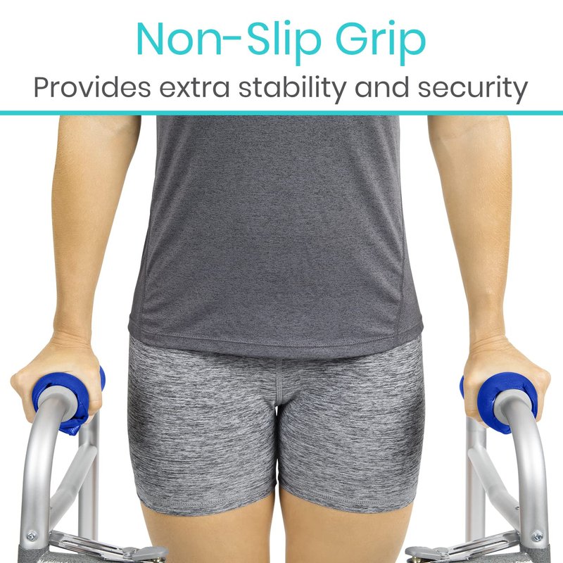 Walker Padded Handles by Vive Reduce hand and wrist soreness and irritation with the Vive padded walker hand grips. Quickly installing on any standard walker, the hand grips are padded with a contoured foam to relieve painful pressure points and reduce hand and wrist fatigue. Durably constructed with a breathable, moisture-wicking material, the handles stay cool and dry to provide a comfortable and secure grip every time. Comfortably Padded Hand Grips: Reducing hand and wrist pain and fatigue, the walker hand grips are padded with a contoured foam for a comfortable and secure grip. Generously padded, the walker hand grips relieve soreness and irritation caused by standard walker handles. The latex-free padded walker handles easily install on any walker with a simple hook and loop closure, providing a stable, nonslip surface for your hands to rest on a walker or other mobility device. Fits on Any Walker: Simple hook and loop closure allows the padded walker hand grips to be quickly installed on any walker without slipping or bunching. Contoured Foam Padding: Contoured foam padding evenly distributes the pressure placed on each hand while using a walker and retains its shape for extensive usability. The latex-free walker handles reduce hand pain and soreness and eliminates skin irritation. Breathable, Moisture-Wicking Materials: Breathable, moisture-wicking materials allow your hands to stay comfortably cool and dry. The walker hand grips are also washable for added convenience. What’s Included: One pair of Vive walker handles