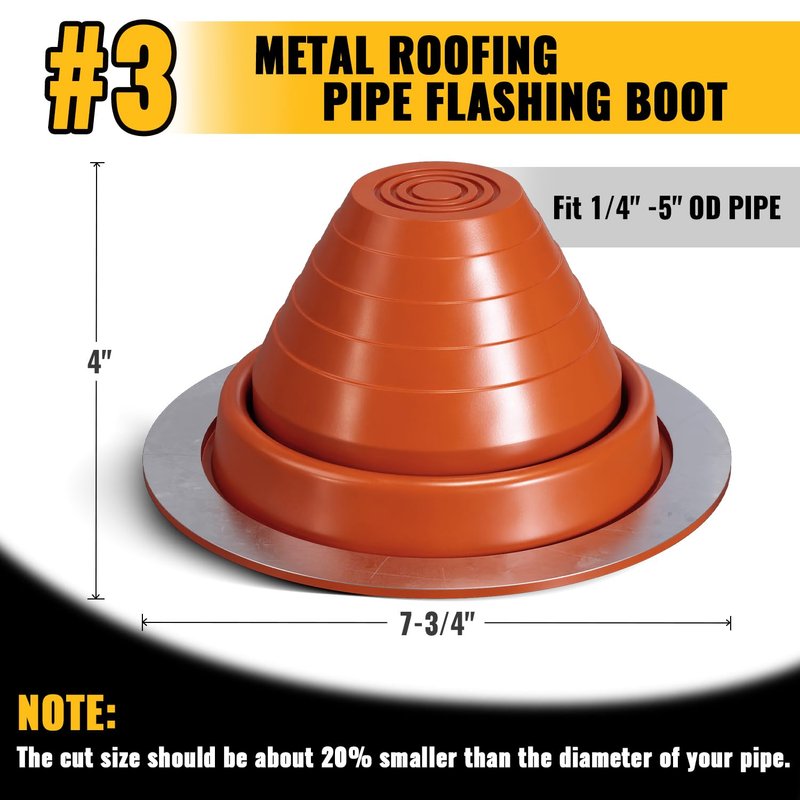 - 【#3 PIPE FLASHING BOOT】#3 Metal roofing pipe flashing is suitable for 1/4"-5" OD pipe. The rubber pipe boot can be cut to size easily. Please make sure to buy the right size pipe boot and don't over tighten screws.