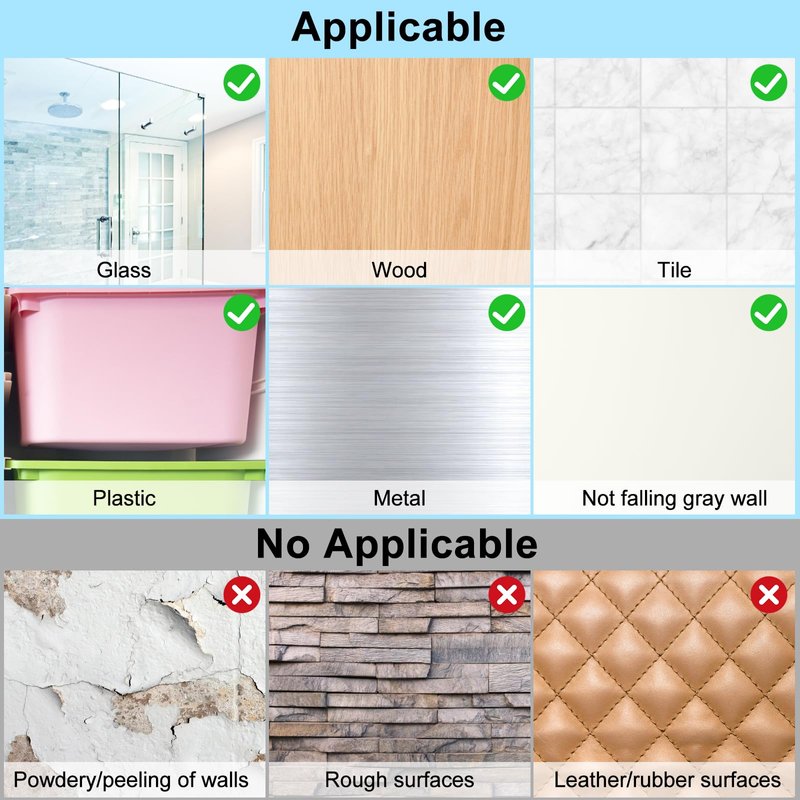 - Note: Do not paste on the painted wall or wallpaper, otherwise the paint or wallpaper will fall off. Adhesives should only be applied to smooth surfaces such as tile, glass, smooth wood, metal, flat marble, or other unpainted surfaces. non-reusable