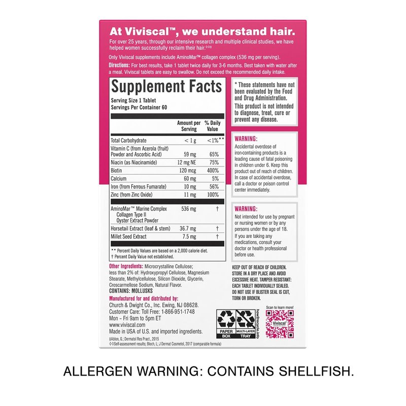 Viviscal Hair Growth Supplements for Women, Dietary Hair Supplement Tablets With AminoMar Collagen Complex, Biotin, Zinc, Vitamin C, and Iron, Nourish Thinning Hair, 30 Day Supply, 60 Count