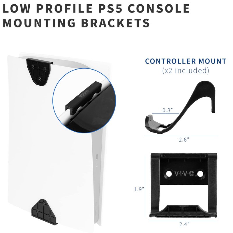 Customize your gaming setup with 2-in-1 (Wall & Desk) Mount Designed for PS5 + 2 Controller Mounts (MOUNT-PS5C) from VIVO! The simple design of this versatile mount holds your PS5 in a safe, convenient location for all your gaming adventures. The bracket supports both horizontal (desk) and vertical (wall) orientation, and mounting hardware is included for wood stud, drywall, and under-desk installation. The open design keeps your PS5 from overheating, and a security lock provides maximum protection. Please Note: This mount is not compatible with PS5 Slim models.