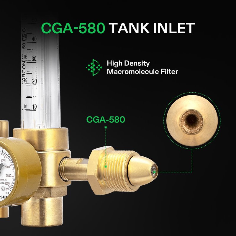 - CGA-580 Tank Inlet: The regulator fits standard Argon and CO2 gas tanks with CGA-580 inlet connection, and has a unique filter port design on the CGA-580 mounting port
