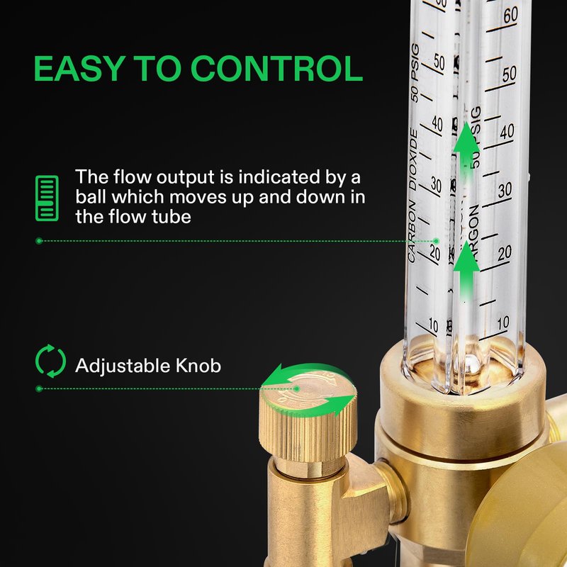 - Precise Control and Measurement: This regulator equipped with a flow meter and pressure gauge; Output flow is indicated by a ball in the flow tube and is adjustable from 10 to 60 SCFH; The pressure gauge ranges from 0 to 4000 PSI and is used to read the amount of gas remaining in the tank