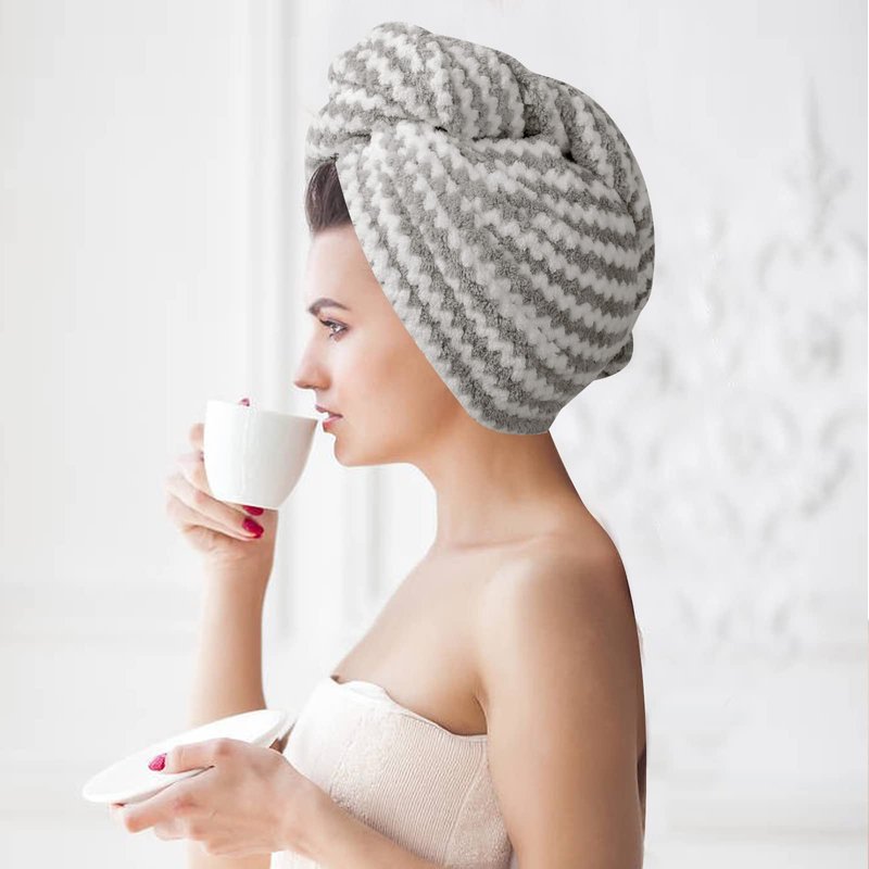 - Unique design - There is a unique elastic band to secure the hair towel turban wrap, so it doesn't sliding down, no matter how long or short your hair is, more or less. It means that you can Dressing, make-up, doing housework, checking mail, all while drying hair