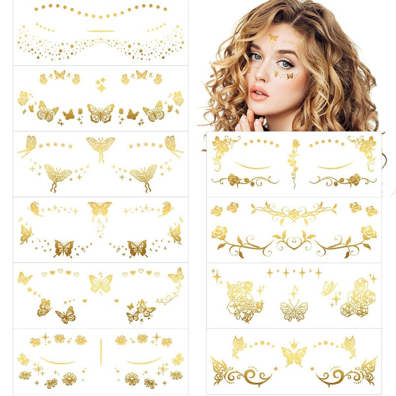 - What You Get: Package includes 10 sheets gold face tattoos stickers for women (6.22"x2.36"/Sheet). VIWIEU 30-Day worry-free Replacement and any questions will be responded in 24 hours.