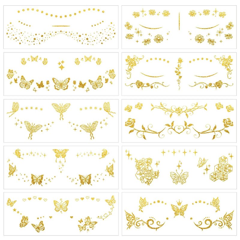 - Great Variety: They come with 10 different sheets gold metallic face tattoos, such as freckle, dots, flowers, rose, butterfly, sparkle, crowns, stars, hearts, they work like fake charms on your skin, which is cute with mix & match potential.