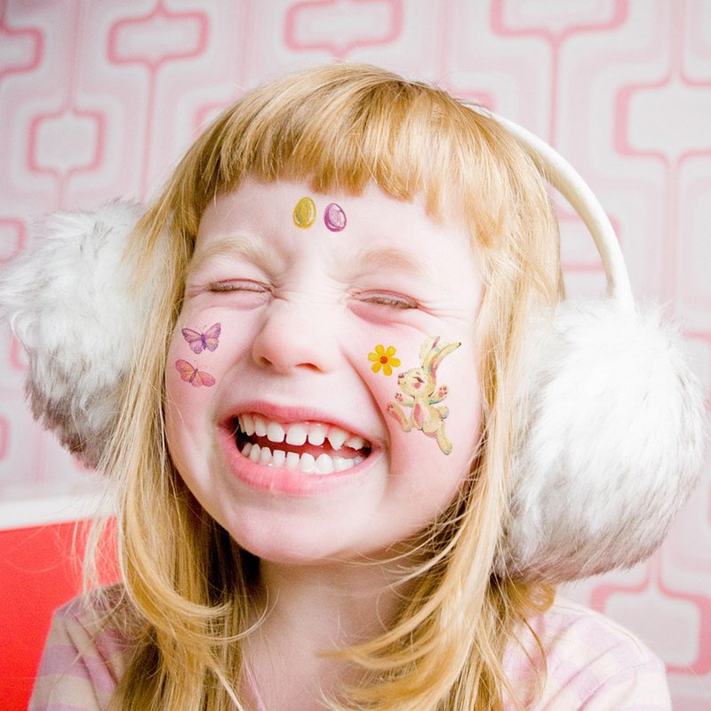 - Glitter Easter Tattoos: Go and celebrate your Easter party with these cute glitter Easter tattoos, featuring as flowers, happy Easter, Easter eggs, bunnies, butterfly, bees, carrots. They are good additions to kids Easter baskets.