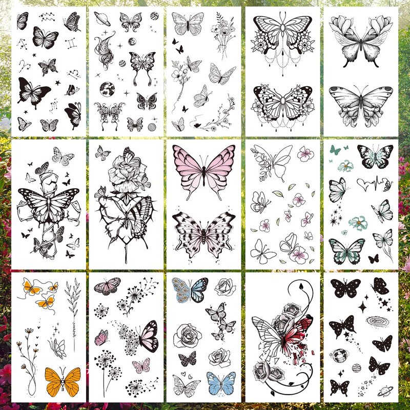 - Realistic&Fun: 15 individual pack small butterfly and flower temporary tattoo set with vivid details, 2.36"x4.13"/sheet, featuring as blue butterfly, pink butterfly, rose, constellation, planet and more. They look so real and cute in a distance, just apply them and have fun with friends.
