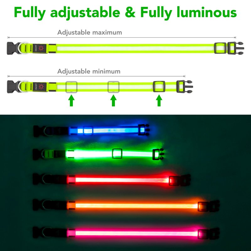 - 【TPU Material & Adjustable】 -- Made of durable TPU and Nylon material, it can make your pet more comfortable.Each LED dog collar can be adjusted by buckle. It also has a heavy-duty D-ring that can be attached with any dog leash.