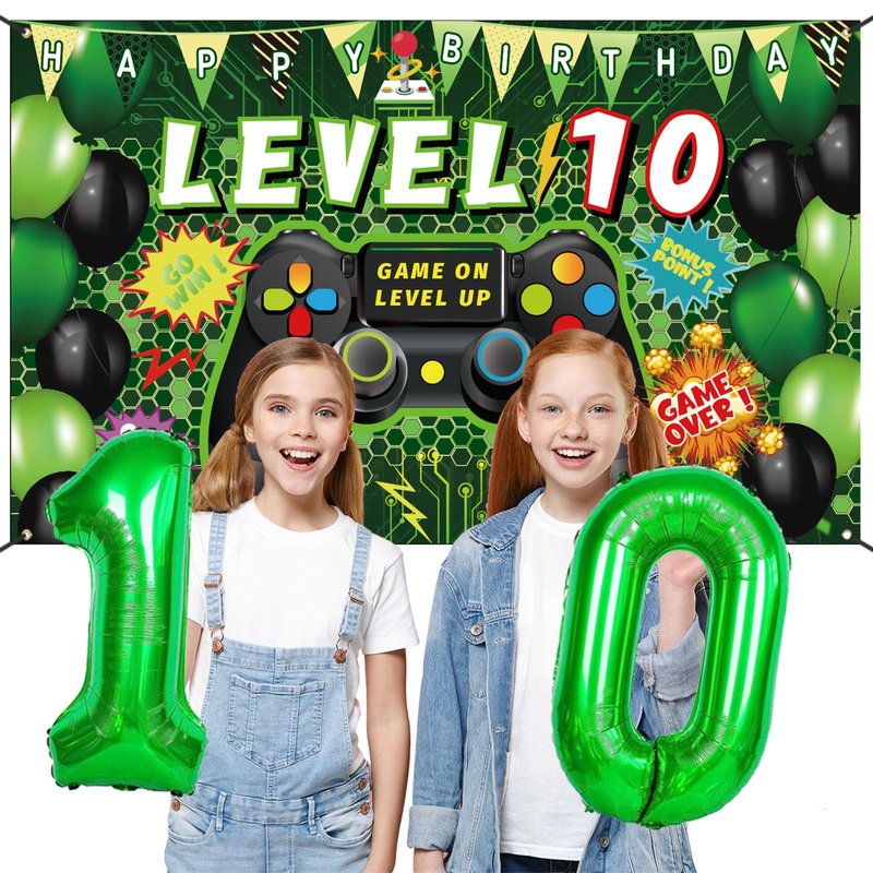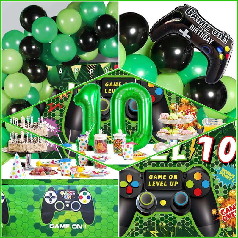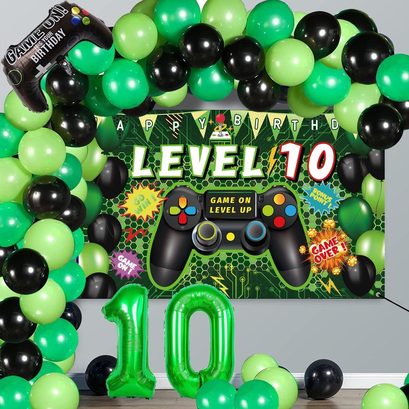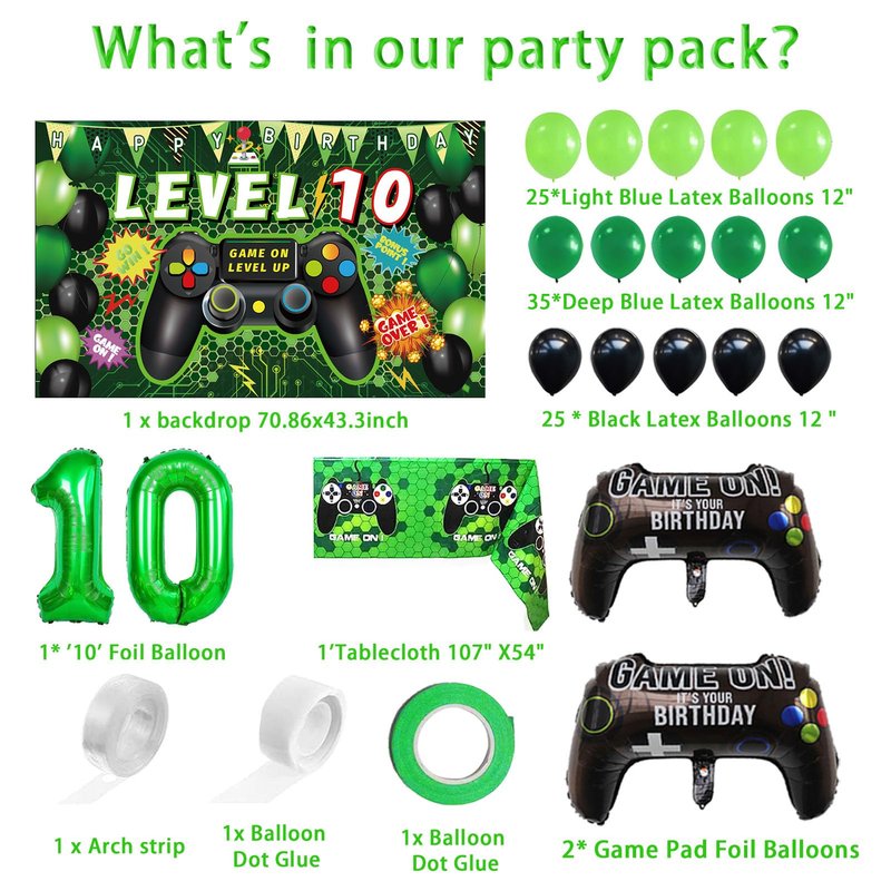 - [Package Included]-The set includes green '10' foil balloons x1, 10th video game birthday backdrop x1, foil gamer balloons x2, green tablecloth x1, 85pcs latex balloon, in addition, 1 roll of balloon dot glue, 1 roll of balloon ribbon, 1 roll of double hole balloon chain, 1 roll of banner rope.