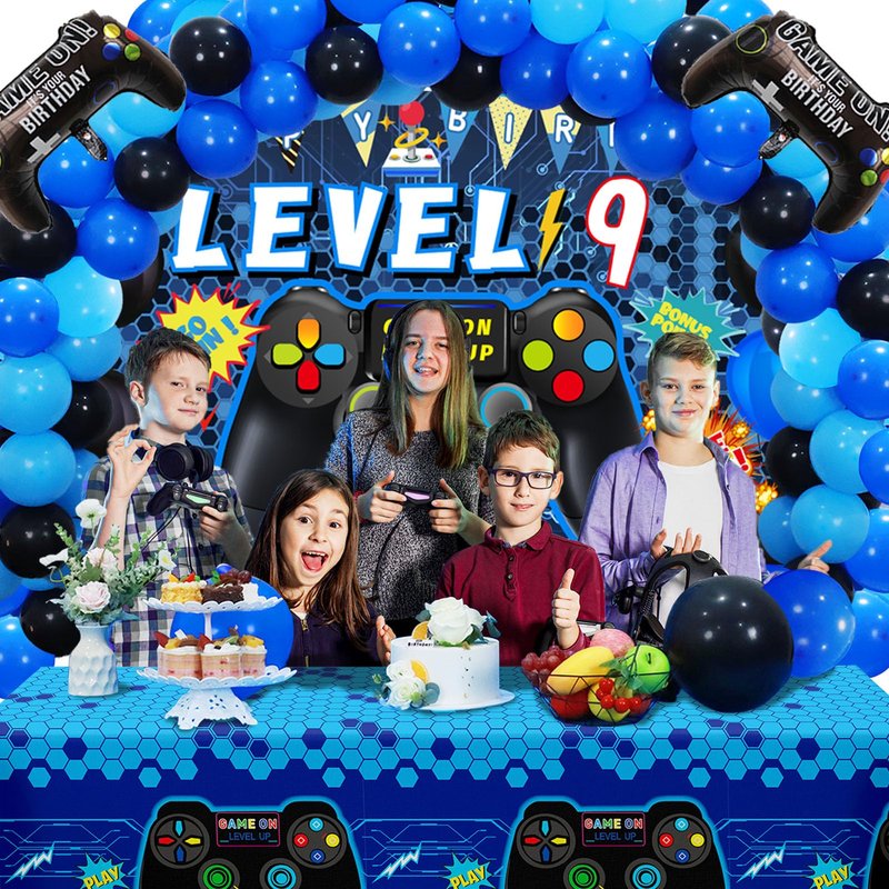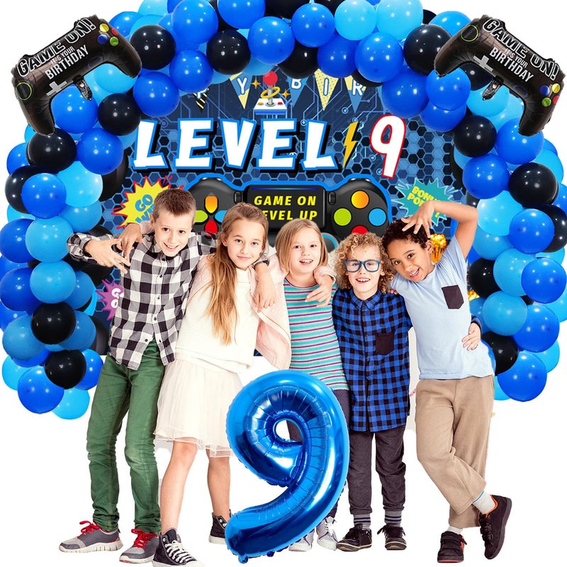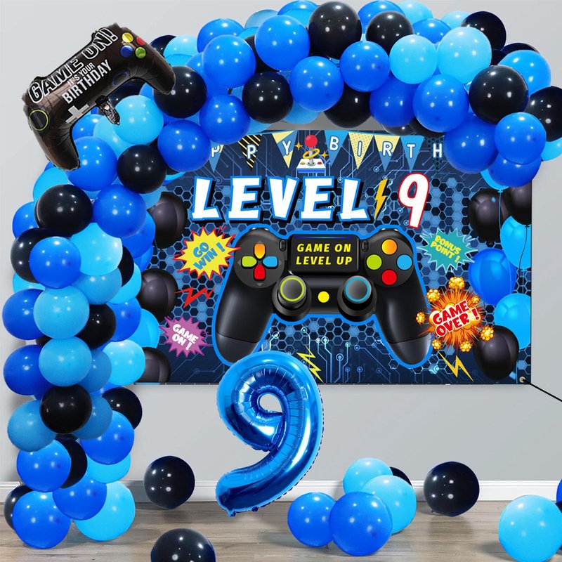 - [Package Included]-The set includes blue '9' foil balloons x1, 9th video game birthday backdrop x1, foil gamer balloons x2, blue tablecloth x1, 85pcs latex balloon, in addition, 1 roll of balloon dot glue, 1 roll of balloon ribbon, 1 roll of double hole balloon chain, 1 roll of banner rope.