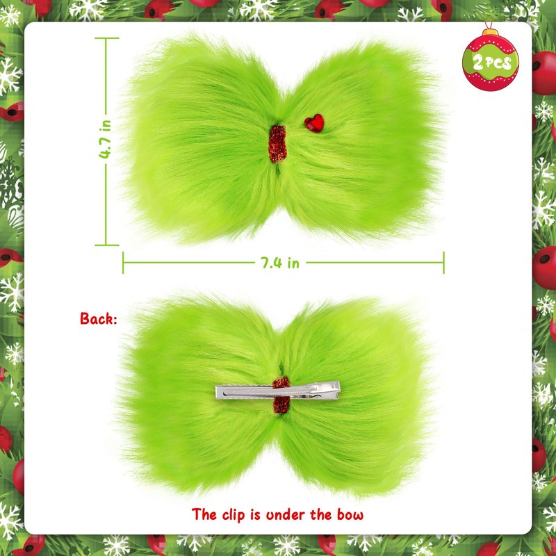 - Green Christmas Hair Bow:Including 2 pcs green hair bows clips,features green furry,decorated with a red heart.They will be a perfect matching to Christmas costumes or Christmas decorations