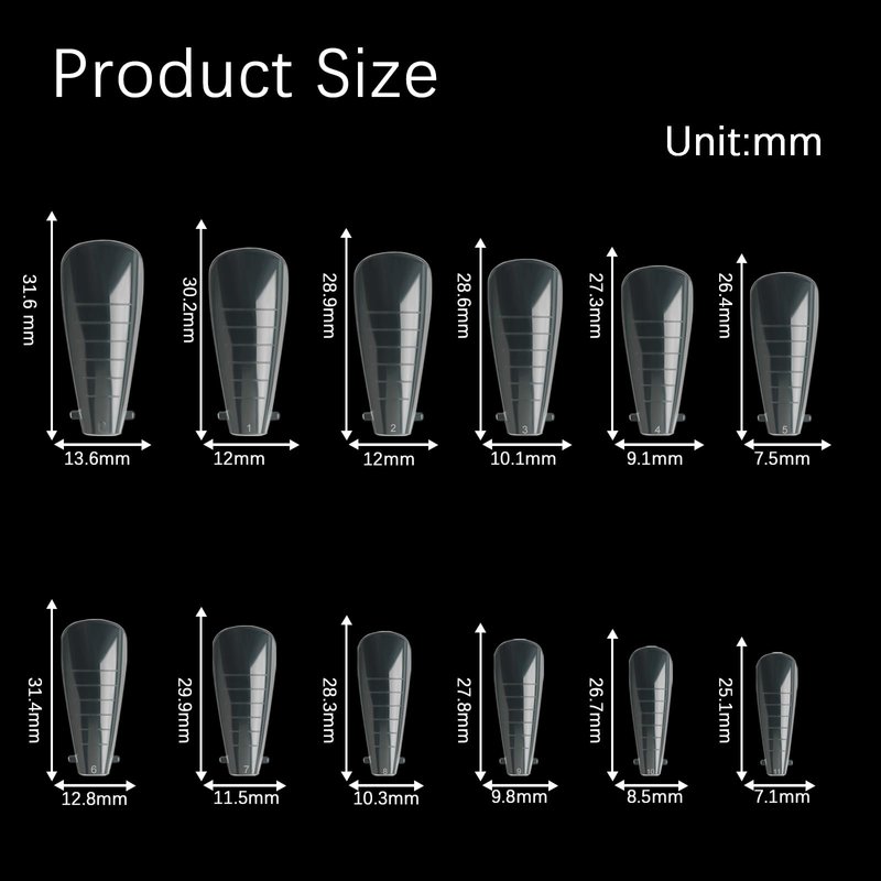 - PERFECT PACKAGE DESIGN: Each size of long nail tips is separated by a small grid, a total of 12 grids, which is convenient for you to distinguish when using. When you are messing with your nails, the tip number of your nails can help keep track and make it easy to choose the right size for your nails.