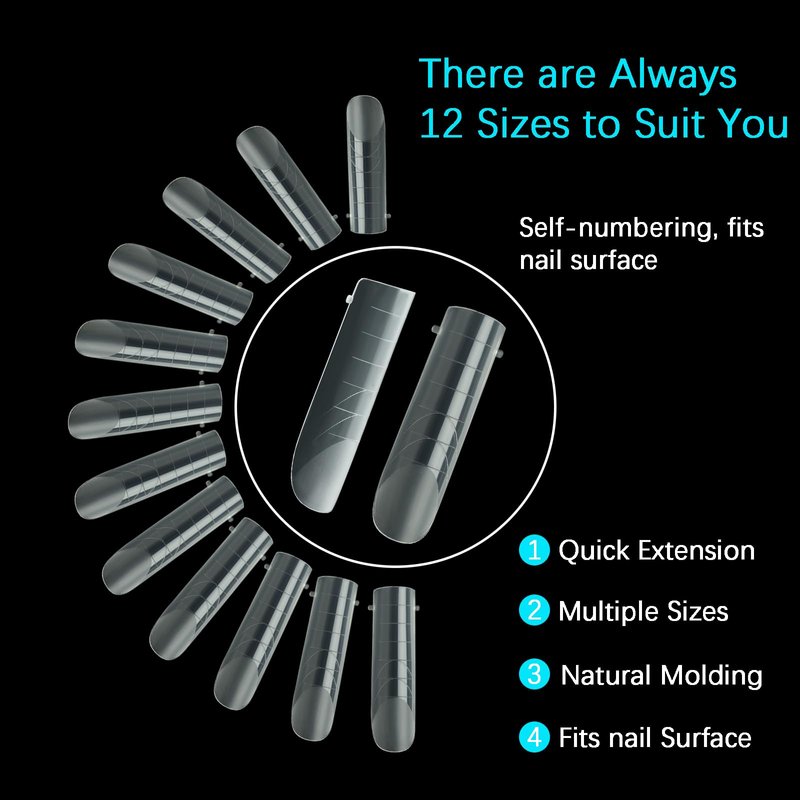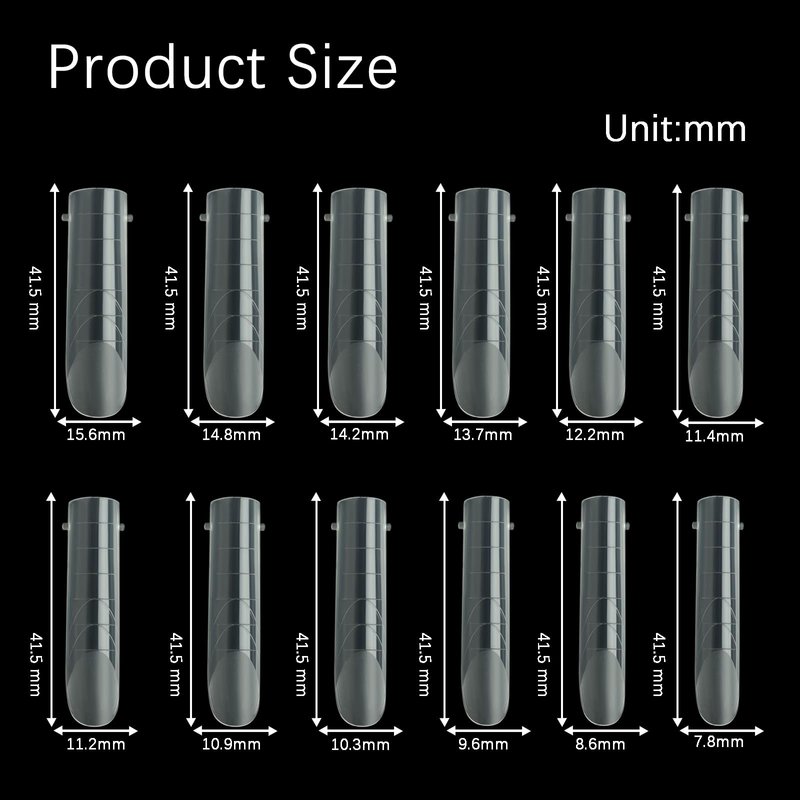 The nail tips are made of high quality ABS material. High strength, good toughness, thick and strong, last about 2-3 weeks, 120 pieces per box of 12 sizes. Specification: Color: Clear Material: High Quality ABS Shape: Long Square Head Frosted Dual Nail Forms Set Quantity: 120Pcs/Case Case Size: 5.71"*4.13"*1.10" Size: 12 size (#0-#11), 10 tips each size, 120pcs totally