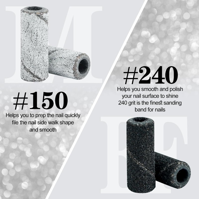 Vnjaoi mini sanding bands come in 150# and 240# grit, making them suitable for all your nail sanding needs. The bands easily attach to the included mini mandrel nail bit, allowing for precise and controlled sanding. Use them for shaping, buffing, and smoothing your nails to perfection. Our sanding bands are compatible with small nail drills and are an essential tool for any at-home manicure kit. Get the perfect nails you've always wanted with our Small Sanding Bands for Nail Drill!