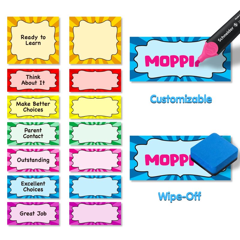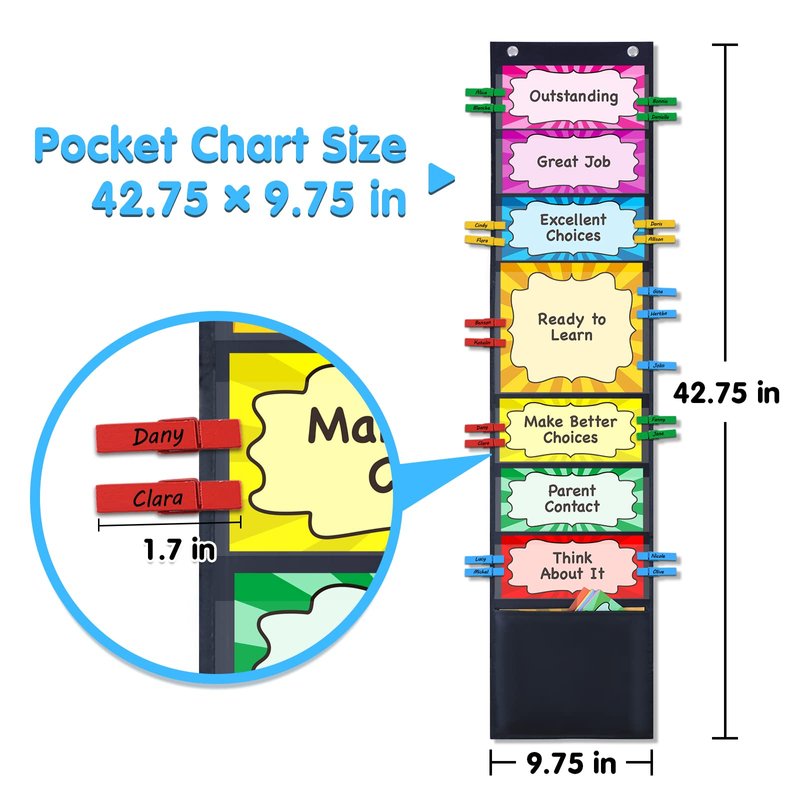 - Creative Behavior Reward Chart: Hanging foldable pocket chart is made from durable material, 7 clear pockets for displaying positive behavior in the classroom or at home, 14 pcs colorful cards(NOT PREPRINTED) and 40 pcs Upgraded larger colorful clothespins included, 1 pocket underneath for easy to storage markers, cards and clothespins.