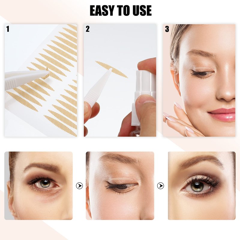 - HOW TO USE: First: Keep eye skin dry, and remove the double eyelid sticker with a clip. Then: Spray a layer of water evenly on the double eyelid sticker. Then: close your eyes to find out the position of the double eyelid crease, and then stick the double eyelid sticker on the eyelid. Finally: slightly close your eyes and wait for the water to dry completely, then adjust it gently with the fork rod according to the eye shape, it is easy to use and suitable for beginners.