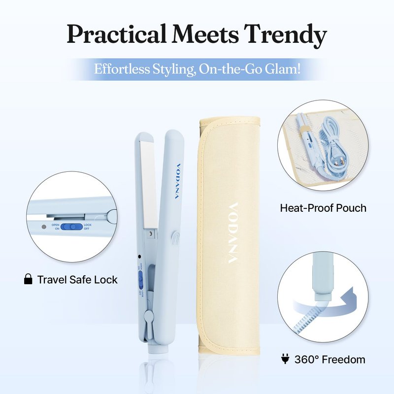 VODANA Pocket Mini Flat Iron, Travel Hair Straightening Iron, Pouch Included, Small Lightweight (Creamy Blue)