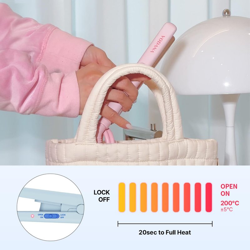 VODANA Pocket Mini Hair Straightening Iron in Pink Vanilla—your perfect travel companion for sleek, smooth hair anytime, anywhere. With ceramic coated plates, it minimizes hair damage and heats up in just 20 seconds. Compact and travel-friendly with Free Voltage compatibility, it fits easily in your bag. Enjoy tangle-free styling with the 360° swivel cord and secure storage with the heat-resistant pouch and lock function. Elevate your style on the go with Vodana!.