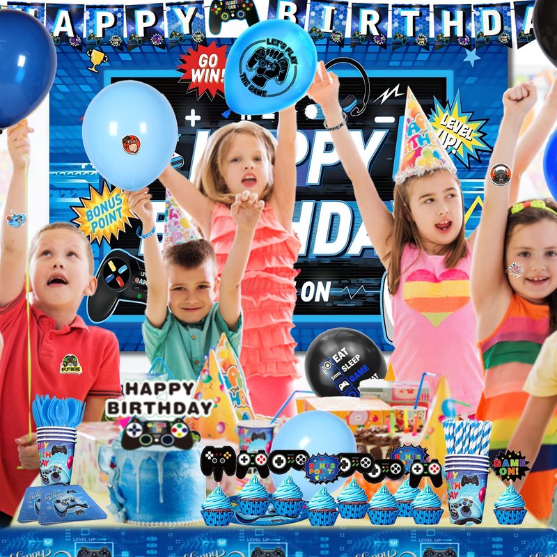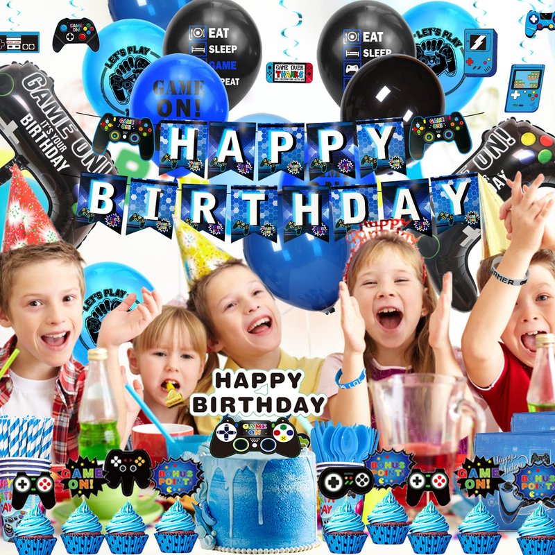 VOFGODI Video Game Birthday Decorations, 240Pcs Gaming Party Decorations for 10 Guests Banners, Balloons and Tablecloths, Boys Birthday Party Set Blue