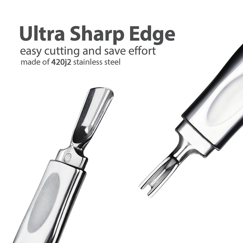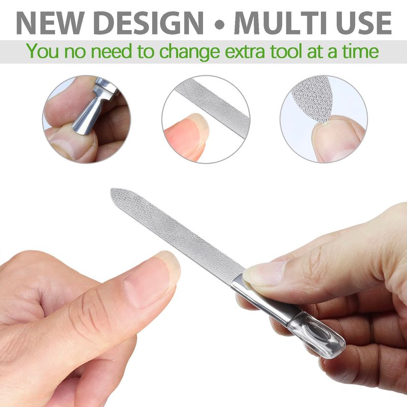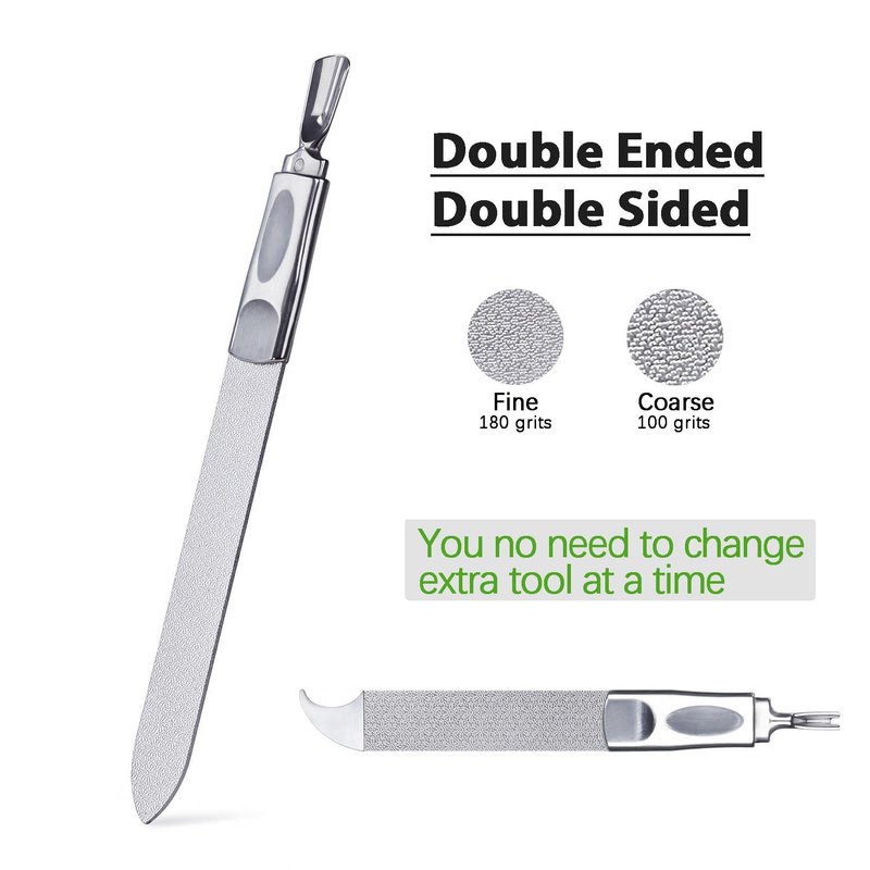- Double Sided and Double Ended Design - Double sided 100/180 grits coarse and fine emery boards, and double ended tools are pusher,cutter and pointed cleaner, design to trim nail more easier