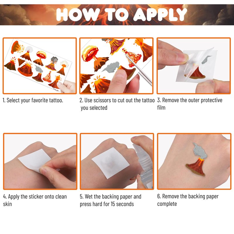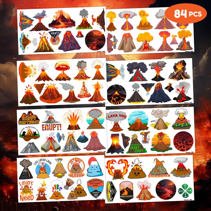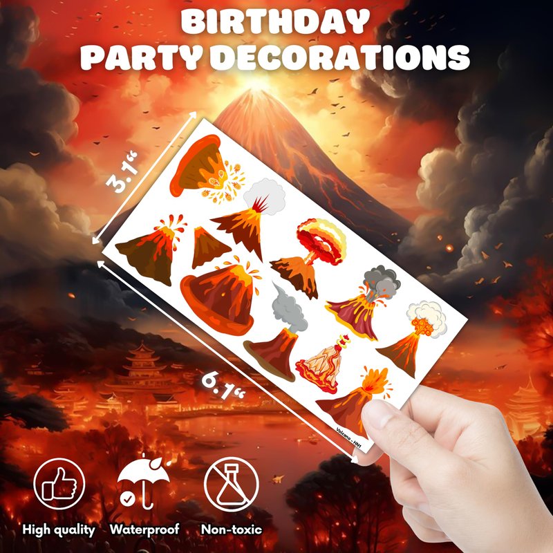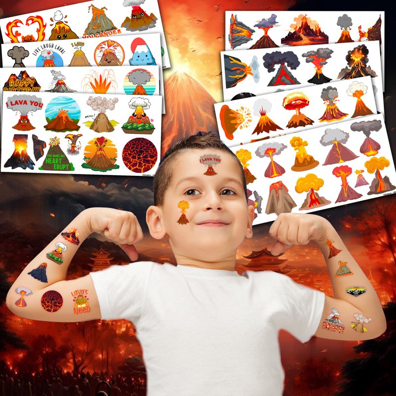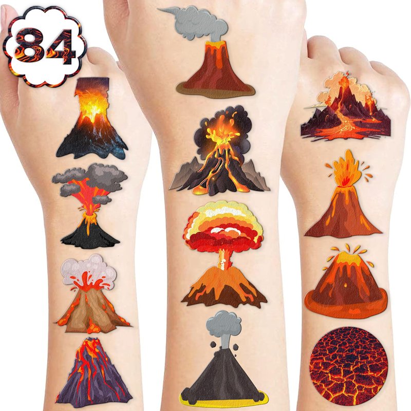 - Pattern rich: Volcano Themed Fire Hot Lava Floor Hawaii Dinosaur Temporary Tattoos for Kids include 8 Sheets 84 PCS, the size of each sheet is 6.1 * 3.1 inches. Having a variety of characteristics, shapes and vibrant colors can stimulate your children's imaginations and bring a creative atmosphere to your Volcano Theme Party.