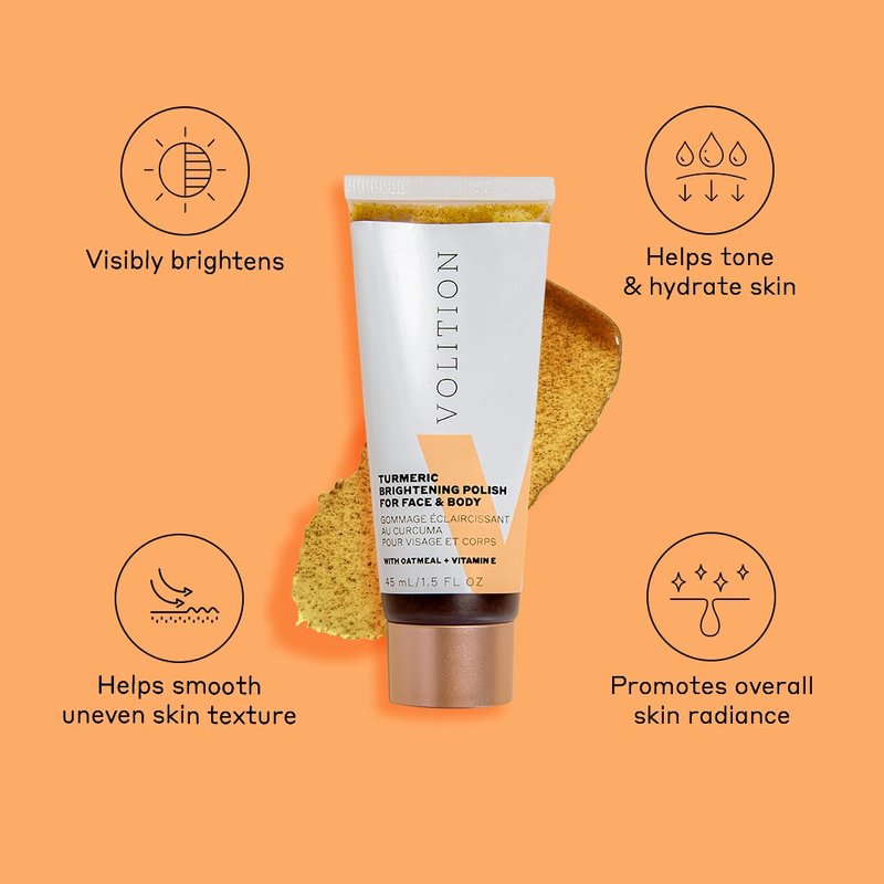Volition Beauty Turmeric Brightening Polish, Travel Size - Exfoliating Face & Body Scrub Removes Dead Skin - Turmeric Extract Boosts Skin Glow - Olive & Sesame Oils Hydrate, Vegan (45ml / 1.5 fl oz)