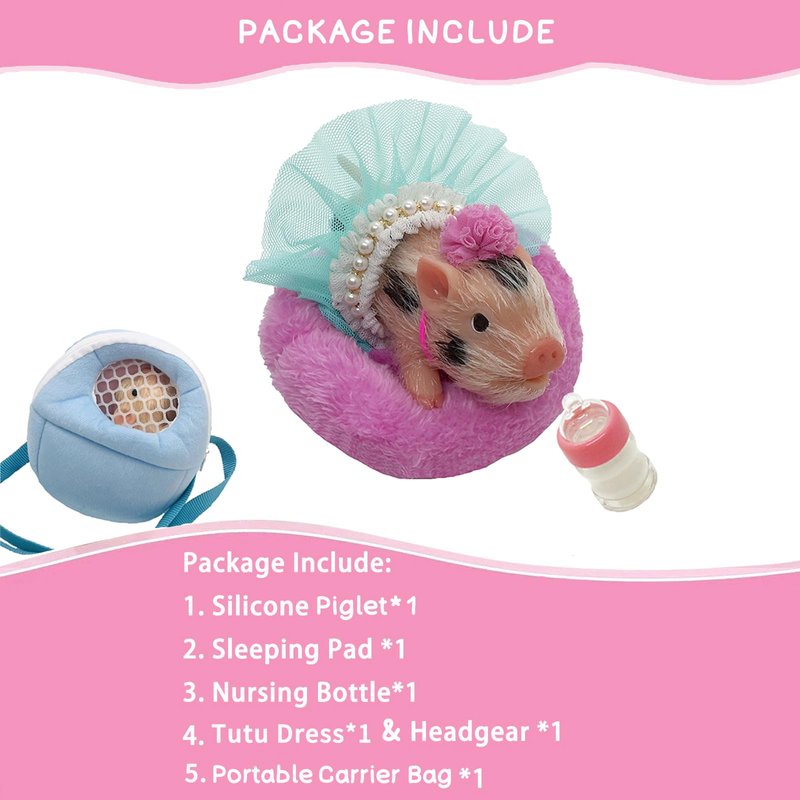 - 【Surprise Package】Amazing silicone piglet accessories meet your child for role play and care games. Package Include: Silicone Piglet*1, Portable Carrier Bag*1, Tutu Dress with Headgear *1, Nursing bottle*1, Sleeping Pad*1