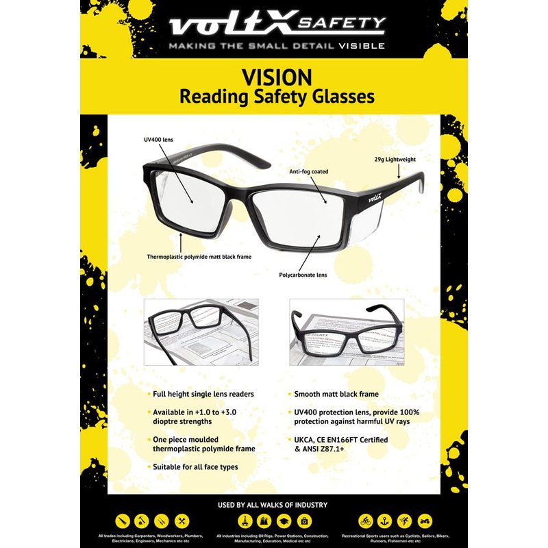 Another first from voltX. Full vision reading strength safety specs available in +1.0, +1.5, +2.0, +2.5, +3.0, dioptre reading powers.. Our reading strength safety glasses are an ingenious way of protecting your eyes whilst still providing a full lens with reading strength corrective powers.