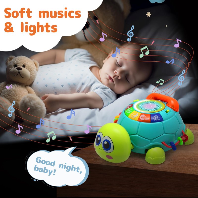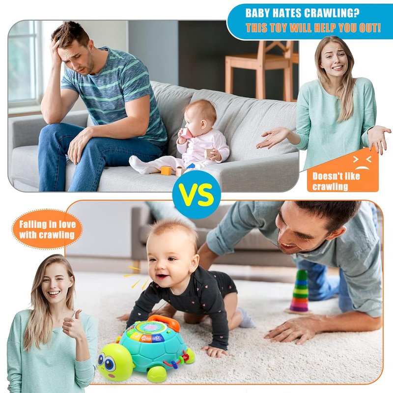 - 【Does your baby not want to crawl?】 This turtle crawling crab 6 month old tummy time toys will solve your worries! Just press the little tortoise button, it will move, nod heads, and play songs and music with LED light! It will attract your baby to chase and crawl, let your baby love crawling.