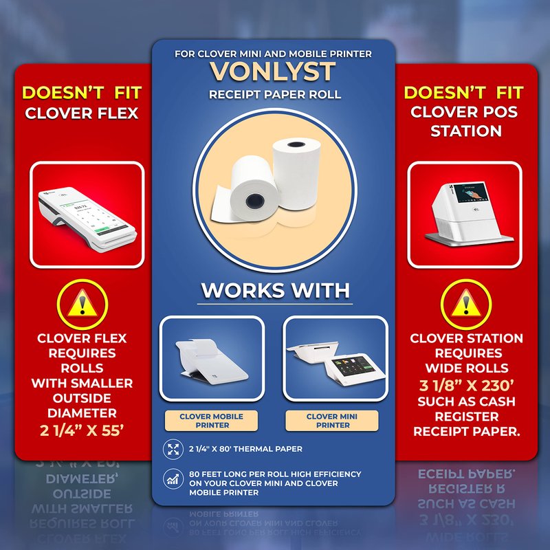 - PAPER ROLL SIZE designed to maximize the performance of your Clover Mini credit card machine System Vonlyst thermal receipt paper rolls are precisely manufactured in size of 2 1/4” x 80’ (width x length)