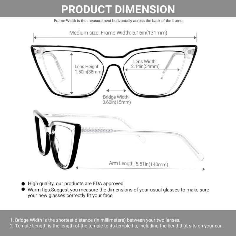 - ❤Dimension -- Lens Width:2.09" (53mm) , Lens Height:1.46" (37mm) , Bridge Width:0.67" (17mm) , Frame Width:5.16" (131mm) , Arm Length:5.31" (135mm)