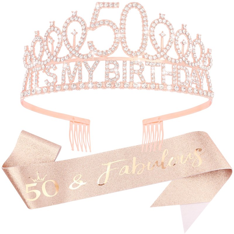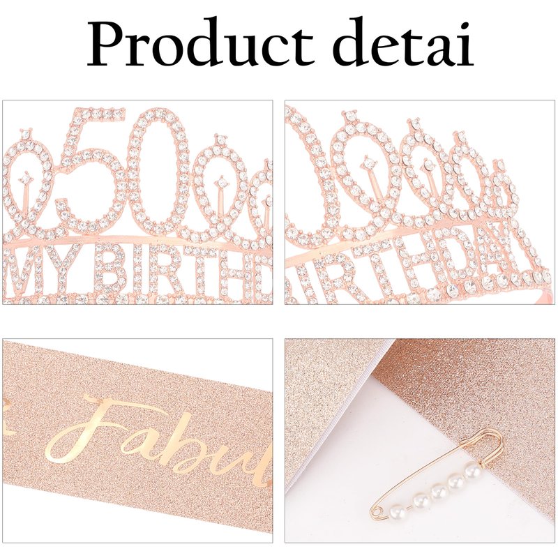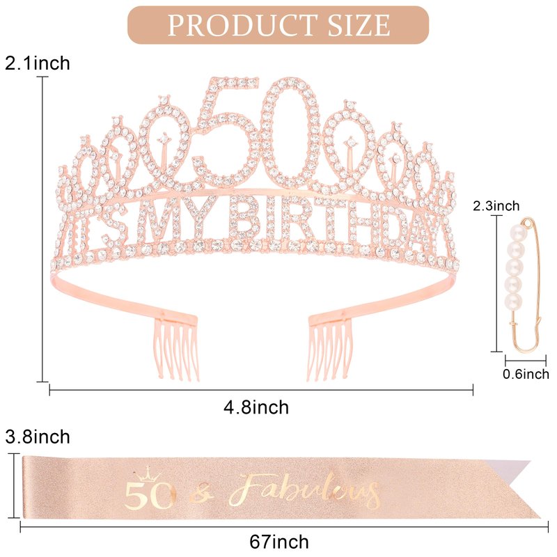 Product Description: 50th Birthday sash and tiara Set is great birthday gift for her! Wearing the sash the tiara to make the birthday protagonist special and stand out from the crowd. BIRTHDAY sash color: rose gold size: Approximately 62INCH long Rhinestones Tiara material: Alloy technique: hand made size: Fit girls and adult head sizes. Pearl pin: Can help adjust the length of the sash Happy Birthday cake topper: Glitter Happy birthday cake topper is good decoration to your birthday party. Package: The kit comes in a small box package.