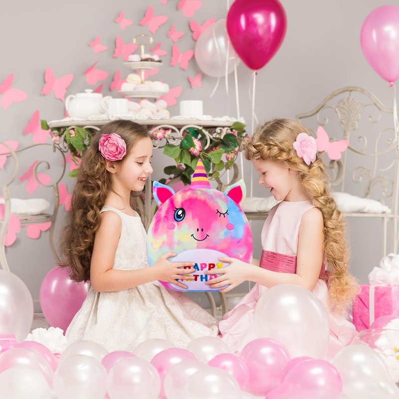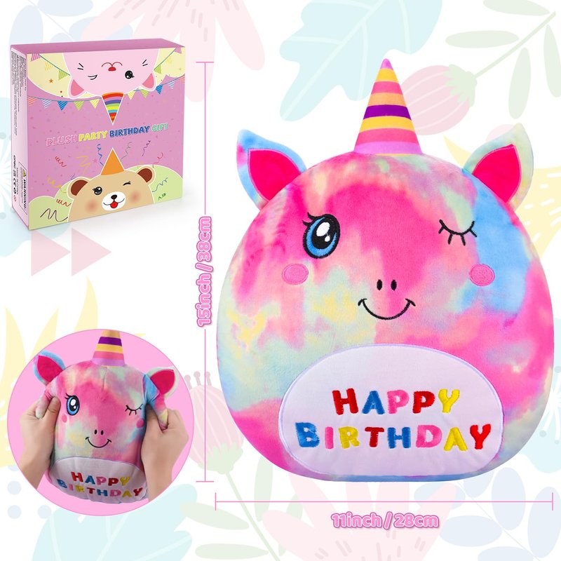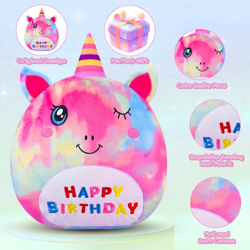 - Original Creative Unicorn Plush: This birthday stuffed unicorn plush pillow features kawaii happy facial expression and cartoon appearance! Wears a colorful clashing birthday hat, the expression and eyes are smiling. The belly is embroidered with the Birthday logo, making it perfect as a birthday gift. These elements blend together to add unique charm to this unicorn plushie toy. All bad emotions and stress will disappear when you embrace it