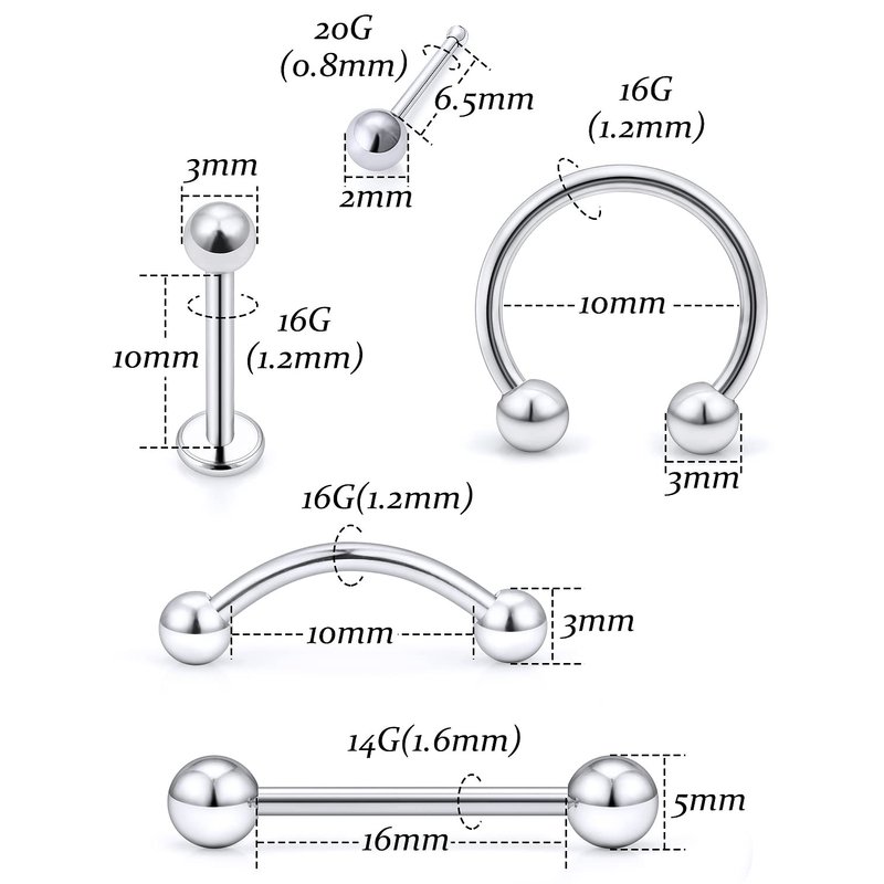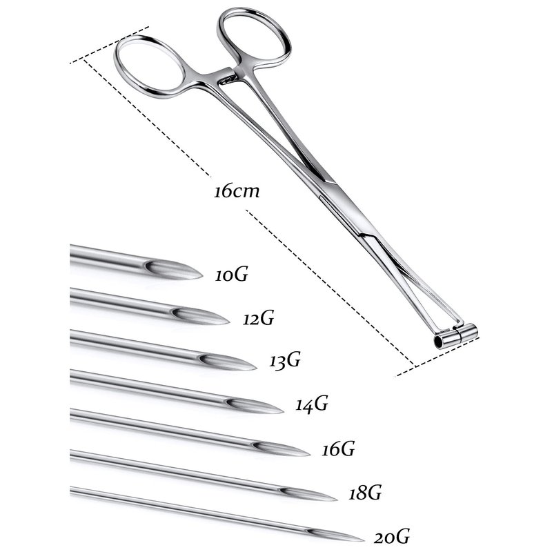- [PRODUCT SIZE]: Forceps Piercing Clamps Piercing Tools: 155mm=6.1inch, Piercing Needles: 20G 18G 16G 14G 13G 12G 10G Each Size 2pcs, Piercing Jewelry: 20G 16G 14G.