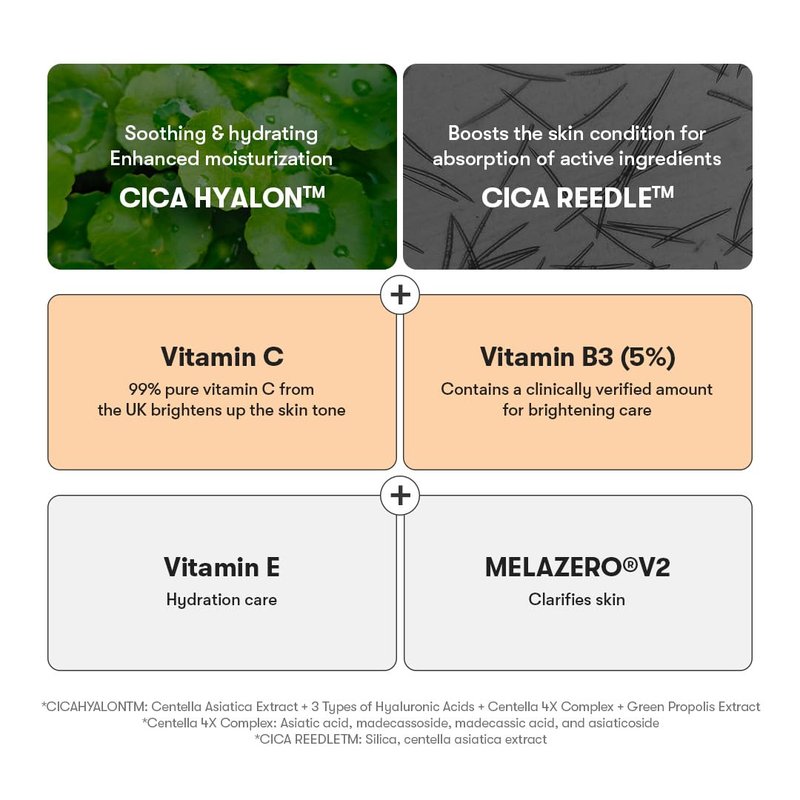 - Vita-Light Reedle Shot provides synergistic effects with VT's proprietary ingredient CICA HYALON, CICA REEDLE, micro particles that boost absorption, and VITA Capsules containing Vitamin C with increased stability!