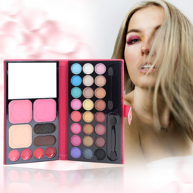 - 【Multifunctional Makeup Palette Set】This multi-purpose make up kit palette includes 24 highly pigmented eye shadows, 4 Lipglosses, 2 eyebrow powder, 2 cheek blushers, 1 pressed powder, 2 Brushes and mirror. All in one makeup kit, you can do your makeup anytime anywhere.